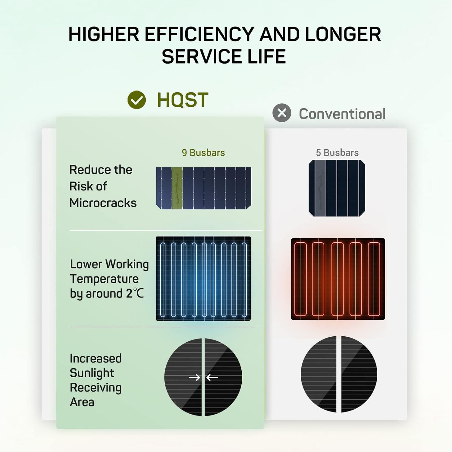 22-23% High Energy Conversion:Grade A+ 166mm large mono solar cells combine industry-leading 9-busbar (9BB) technology to deliver up to 23% conversion rate, roughly 1.2 times the efficiency of conventional panels, allowing you to extract more power from the sun.