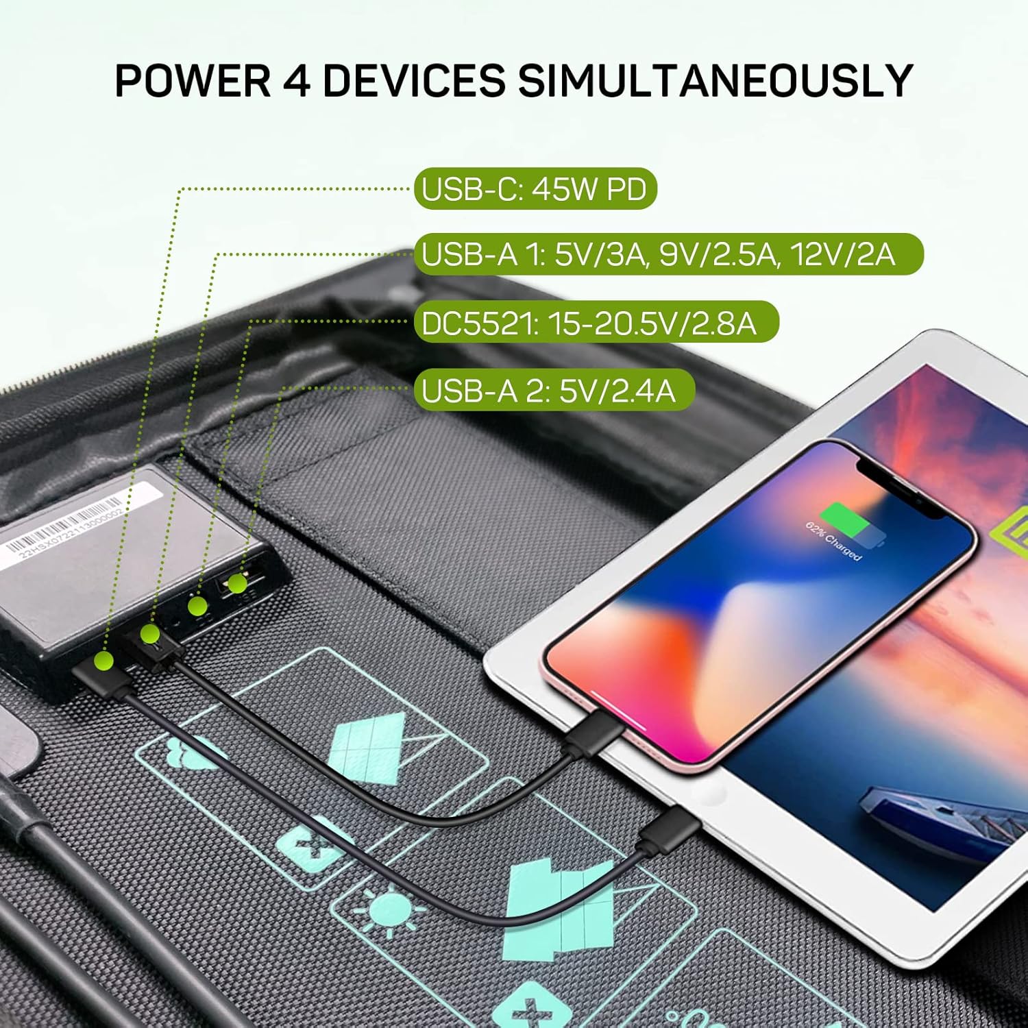 Power 3 USB Devices Simultaneously:The built-in safety USB hub supports charging 3 USB devices and 1 DC-powered device simultaneously. You can charge your laptop using the 45W USB-C PD port, and charge your drone, phone, or camera using USB-A ports. (Note: The panel does not store power, but it will charge devices directly when exposed to sunlight.)