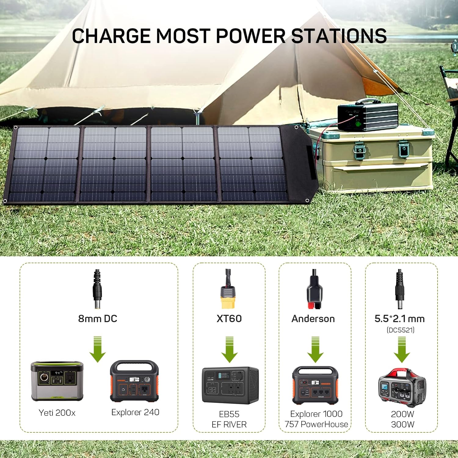 Charge Most Solar Generators:With the included 4-in-1 solar adapter cable, our foldable solar panels support charging most portable power stations. The 8 mm DC connector is compatible with Goal Zero Yeti and Jackery Explorer; the XT60 is compatible with Bluetti and EcoFlow; the Anderson port is compatible with Jackery and Anker; the 5.5*2.1 mm (DC5521) is compatible with Rockpals.