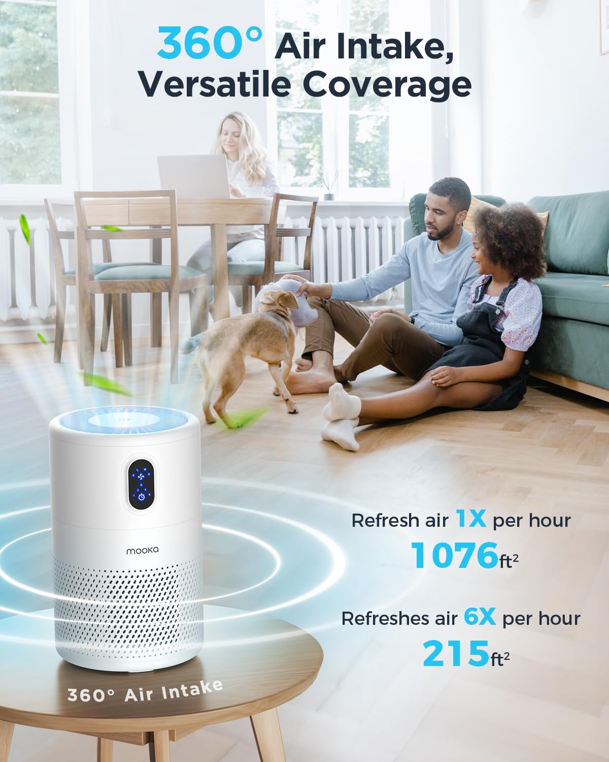 MOOKA B-D02L AIR PURIFIER FOR LARGE ROOM: With the high-efficiency filtration system, the air purifier covers an area up to 1076 ft². 6 air changes per hour in 215 ft², 1 air changes per hour in 1076 ft². Modern design fits in any space from small to large rooms, bedrooms, living rooms, offices, nurseries, kitchens and basements. Perfect for pet owners, babies, children, the elderly, or anyone wanting to improve the air quality