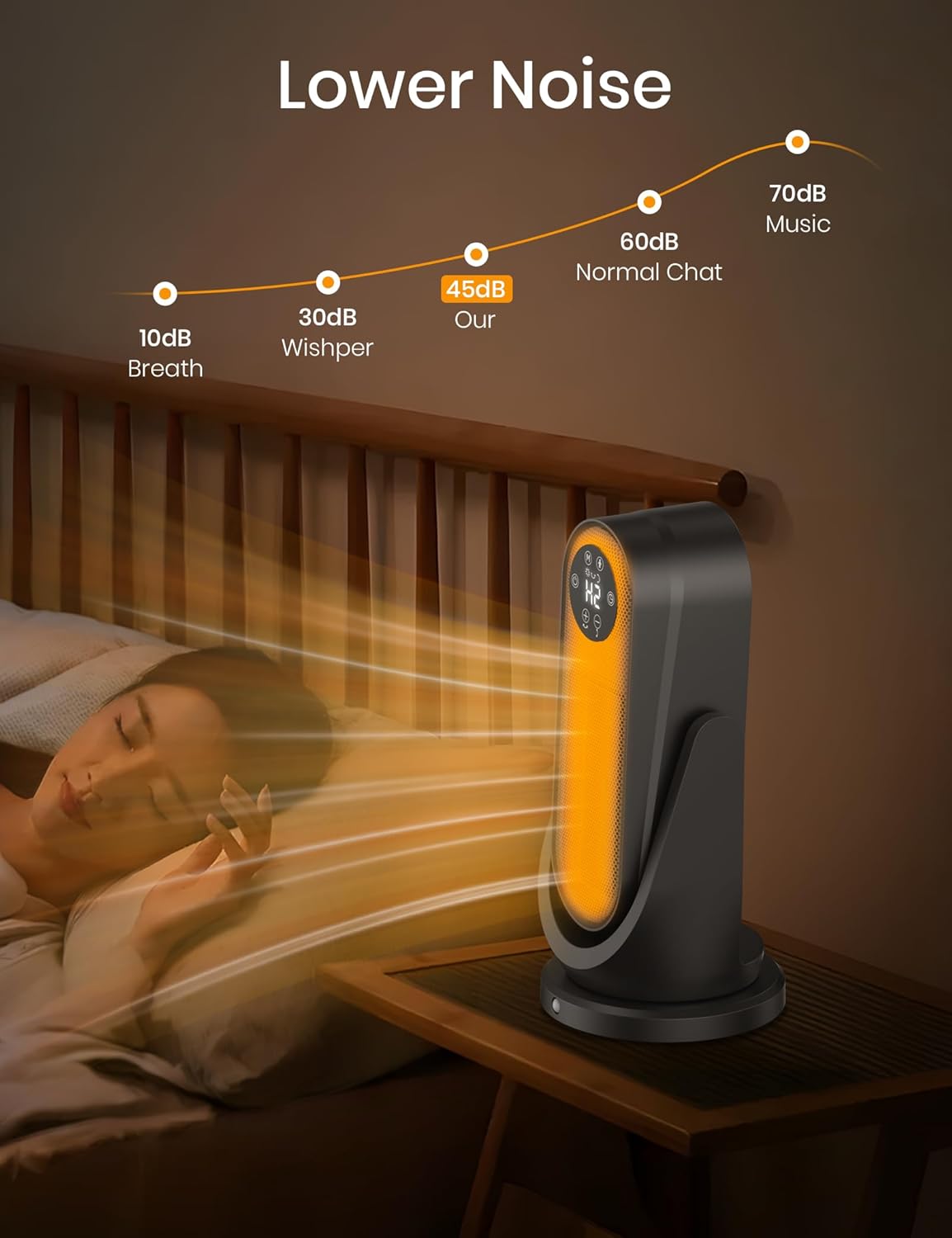 [Quiet Heating & Timer]: The space heaters adopt a brushless DC motor and wing-shaped fan design to reduce turbulence and make the airflow smooth, effectively reducing wind noise, and the noise is reduced to only 45dB. Quiet heating allows you to be undisturbed on cold winter days, which is very suitable for working and sleeping peacefully. This space heater office has a 12-hour timer so you can set a specific time to keep the area comfortable, and the space heater will automatically shut off when the time is reached.