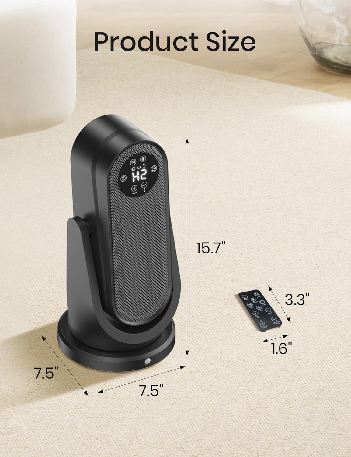 [Usage Comfort]: 7.5″ x 7.5″ x 15.7″, 4 lbs This portable heater has a built-in hidden handle for easy mobility. With the heater’s user-friendly touchscreen control and convenient remote control (with batteries), you can easily adjust the settings in your room anytime, anywhere. Removable air inlet and filter for easy cleaning. The 15.7″ compact design makes our space heater a real space saver. Cord length: 4.5 feet/1.3 meters.