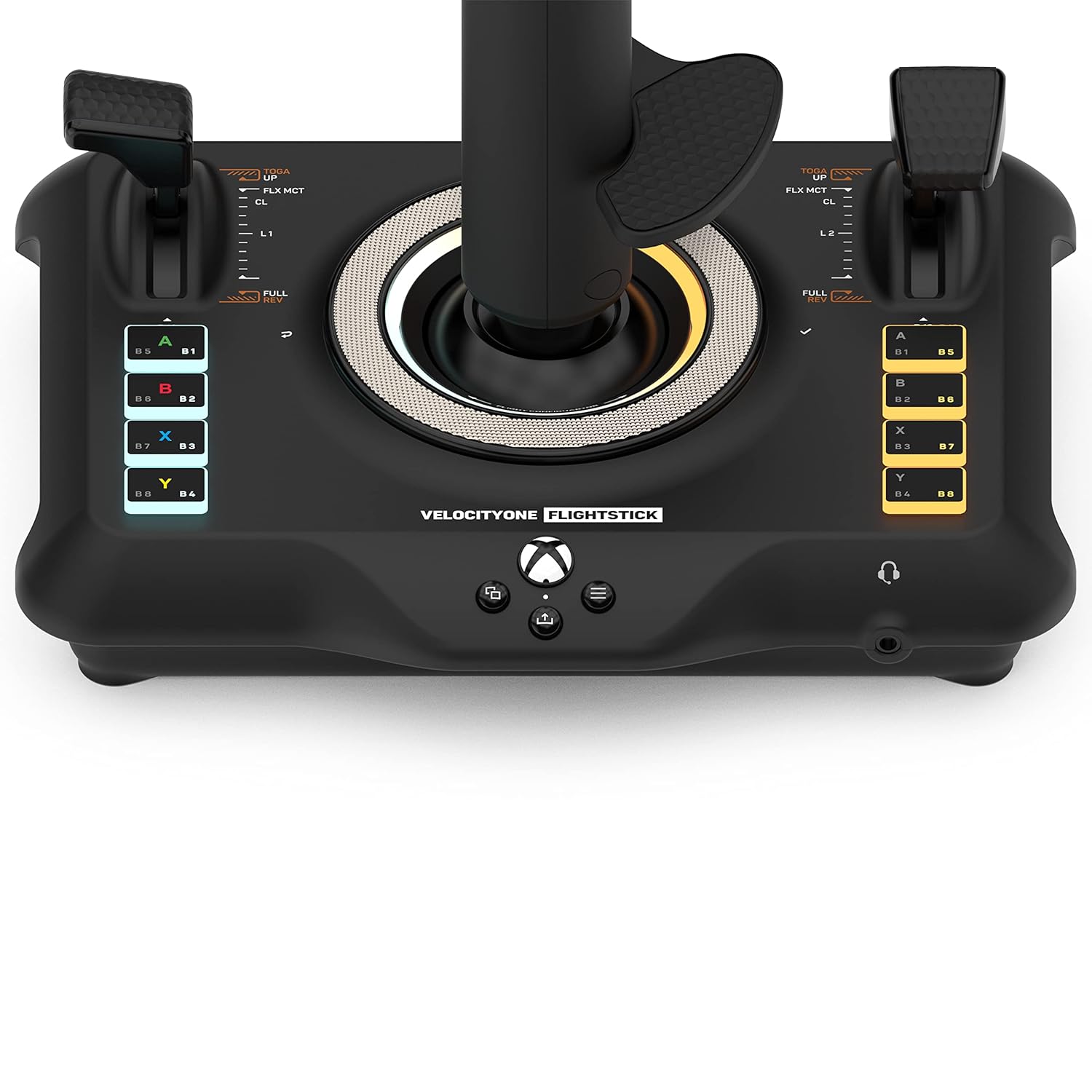The Turtle Beach VelocityOne Flightstick for Xbox Series X|S, Xbox One & Windows 10 & 11 PCs equips you with immersive, accurate controls for navigating air and space flight simulation & combat games on Xbox and PC. High resolution non-contact sensors provide precise response and extended longevity to the main stick controls, while throttle and flap levers control main engine power and make for quick adjustment of secondary control surfaces. Plus, the levers can be customized with swappable throttle heads to suit the aircraft you are flying. Precision detents at the minimum and maximum positions allow activation of full reverse thrust at minimum, and afterburner, boost or Take Off/Go Around thrust at maximum. An ultra-precise nano trim wheel allows for fine tuning of attitude, and an analog POV hat allows freelook in cockpit views or strafe thrusters in space simulation games. An OLED Flight Management Display makes for easy adjustments to control profiles, trim wheel input mode, rudder lock and more. Navigate the FMD using an intuitive rotary dial with click at the base of the stick to configure, and update product performance in real-time with all information stored in on-board memory. 27 programmable buttons, including an 8-way digital POV hat, rapid fire trigger, stick mounted buttons, dual throttle lever detents and 8 programmable base buttons equip you with an arsenal of adjustable controls to your most critical simulation functions. Pilot fighter jets or airliners thanks to an ambidextrous right and left-handed design with a reversible wrist rest, and programmable base buttons allow the entire setup to be configured for right, or left-handed controls. Take customization a step further and adjust the color, brightness and response of multiple RGB LED zones. Familiar Xbox controls allow for easy console operation, and you can switch input mode to PC to play across a wide range of simulation titles. Plus, the Flightstick can be used alongside the Turtle Beach VelocityOne Rudder Pedals on PC and Xbox*, for an even more immersive flight experience.
